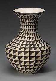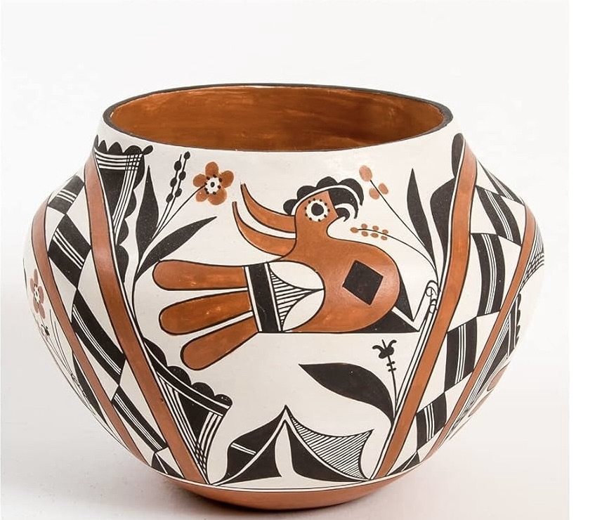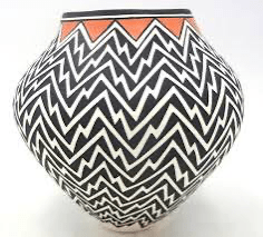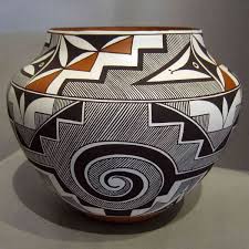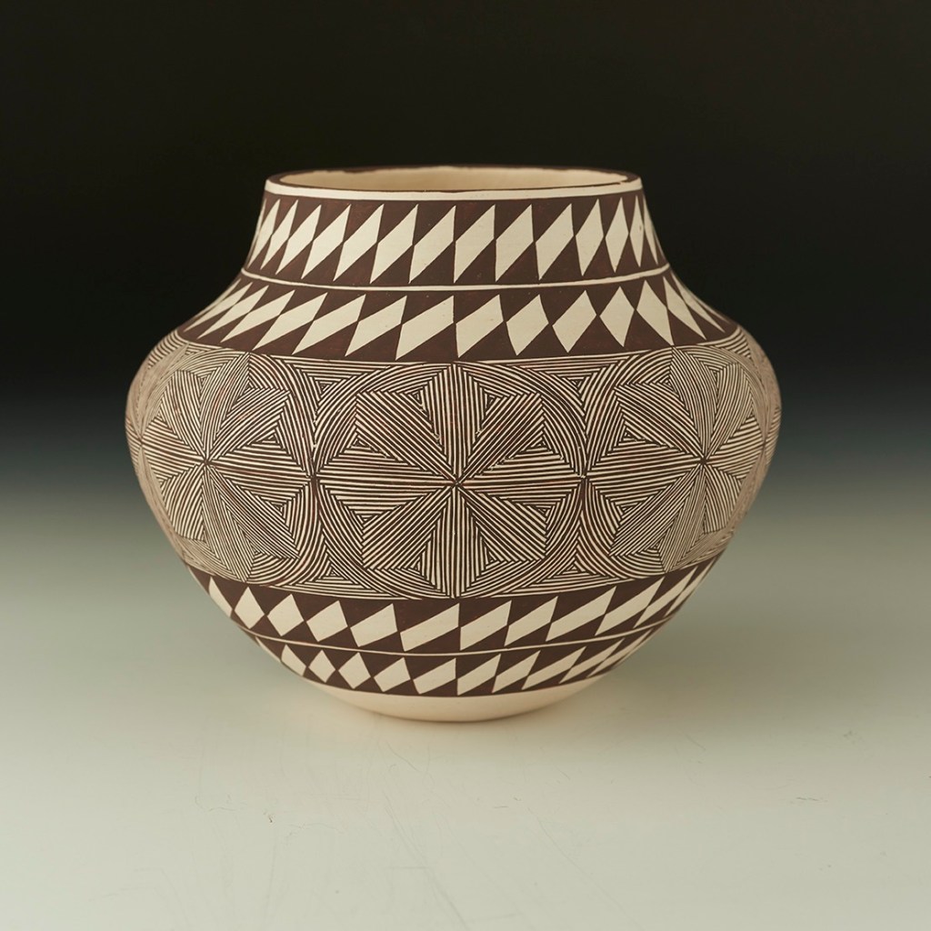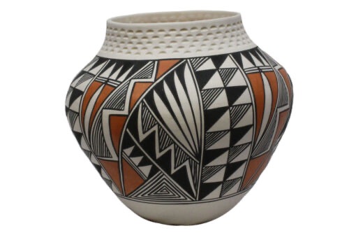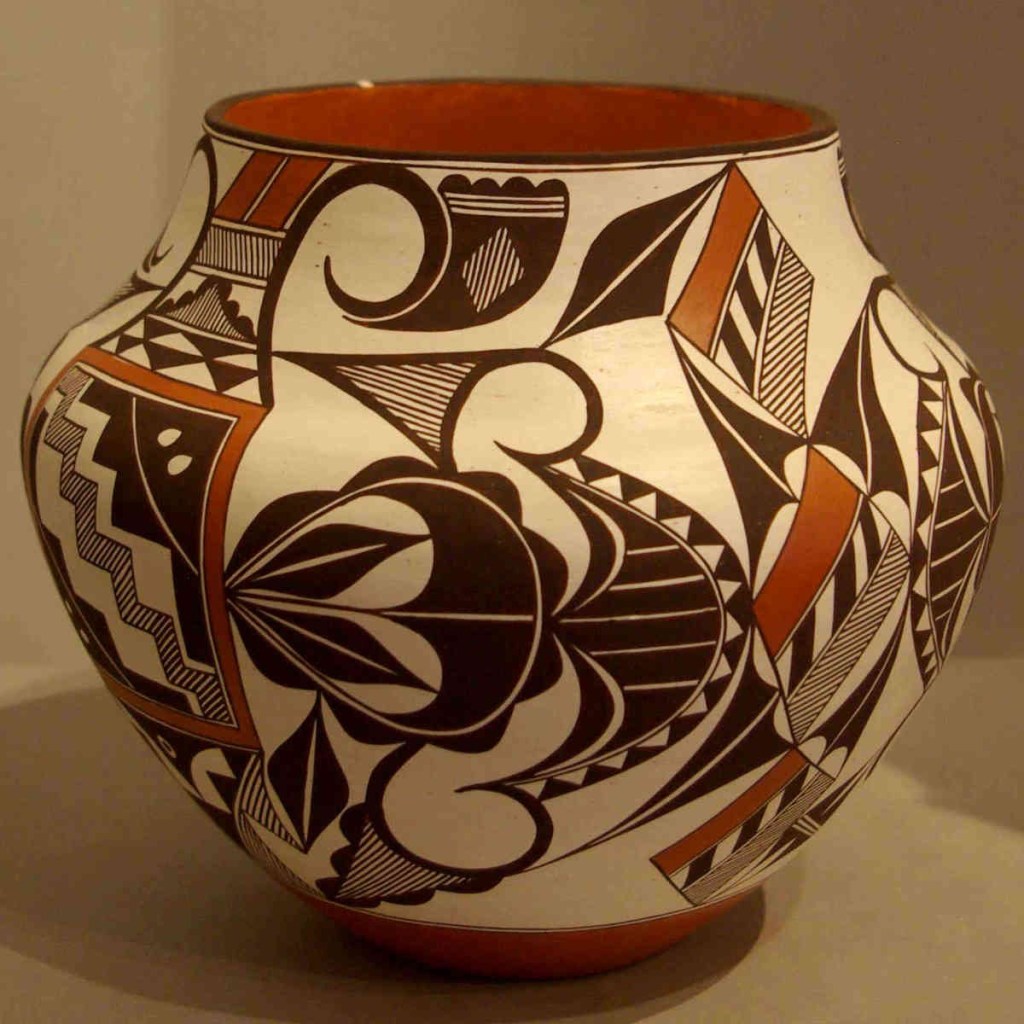 Her pottery – a mixture of traditional Acoma styles and modernist influences – characterized by bold geometric patterns and vibrant colors