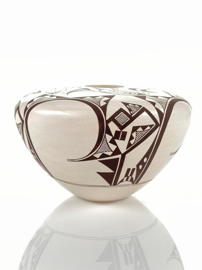 Her black-on-white vessels featuring parrots, deer, and other animals are highly prized