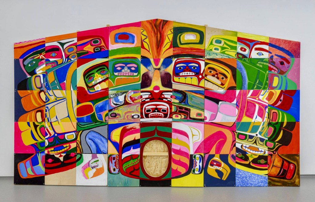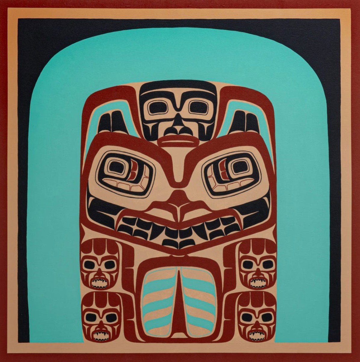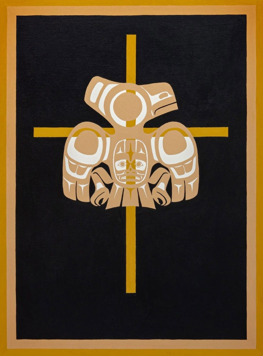 The hallmarks of his art are blending traditional form lines and myths with contemporary symbols, using his personal experiences, and historical events.