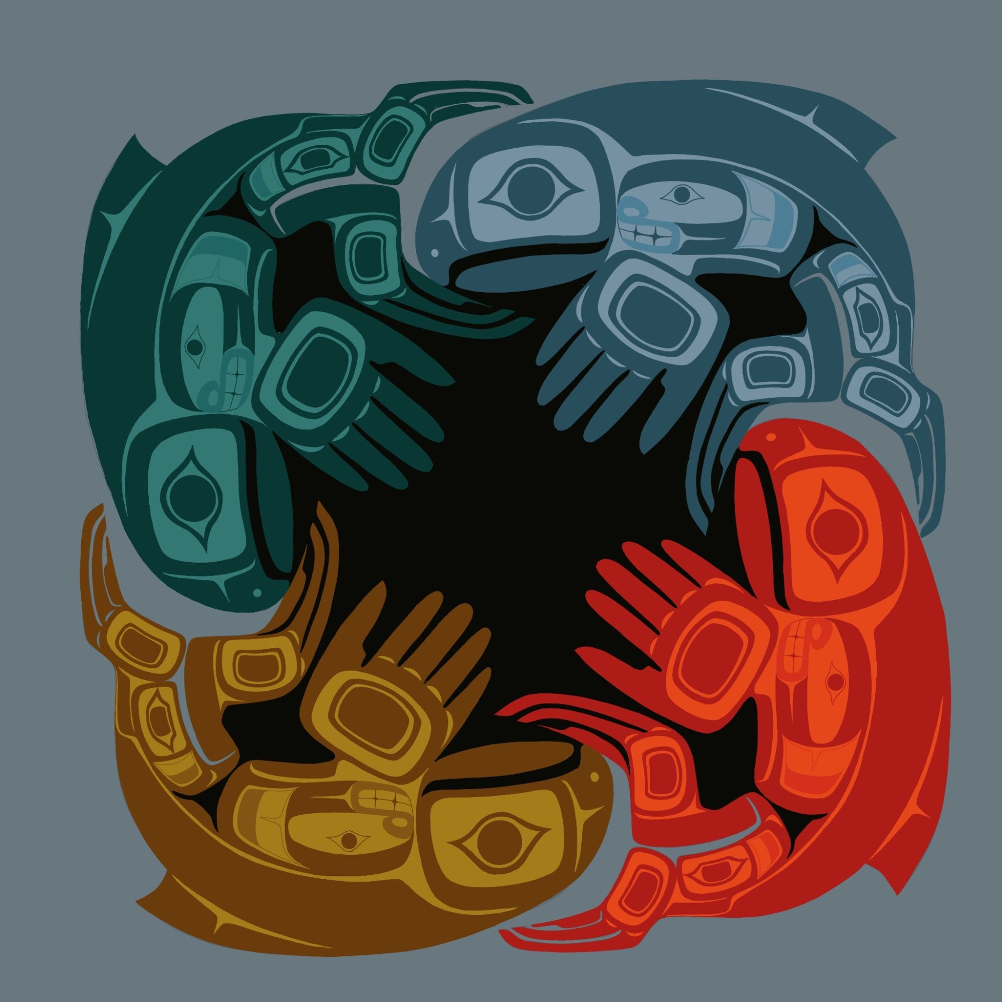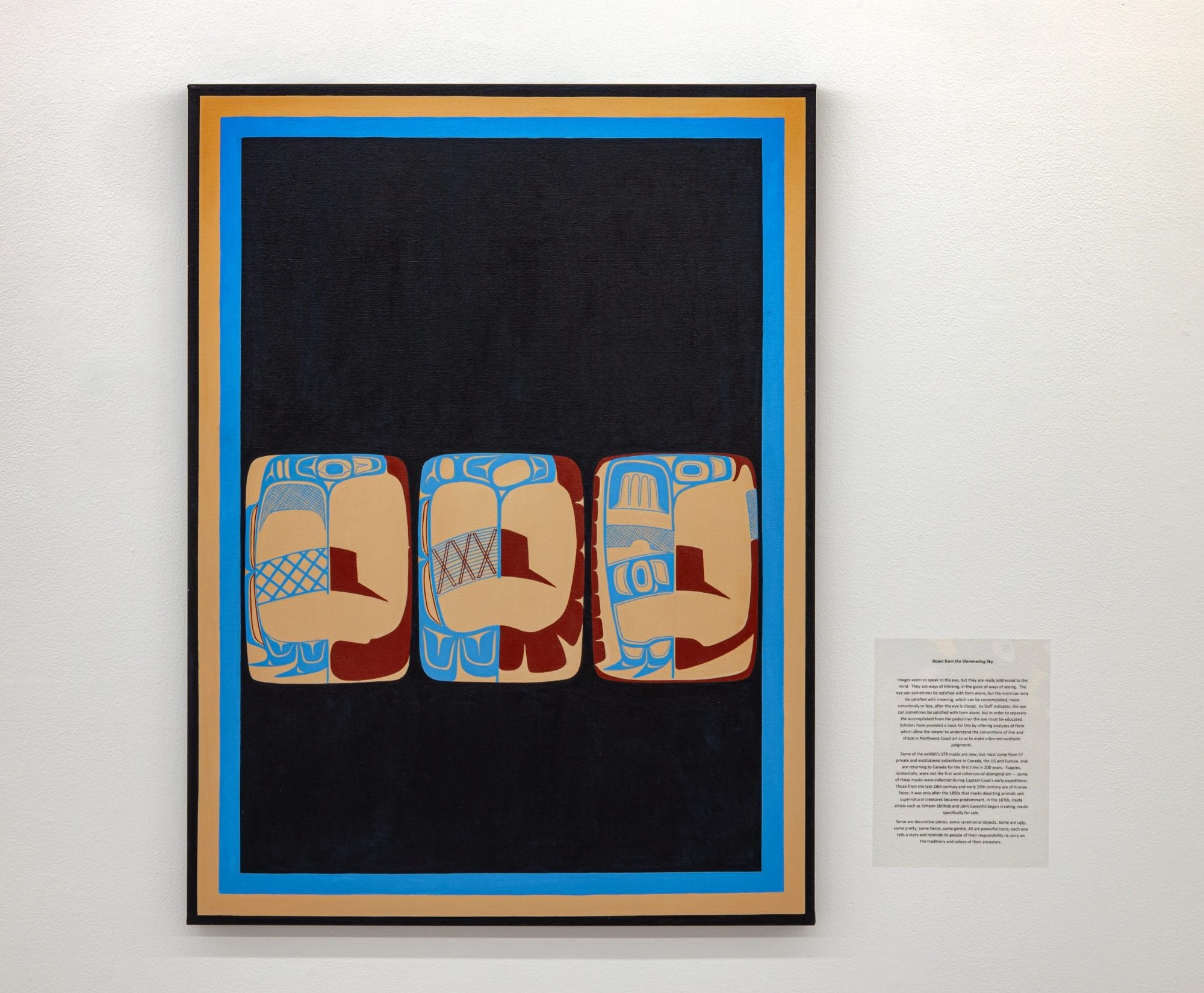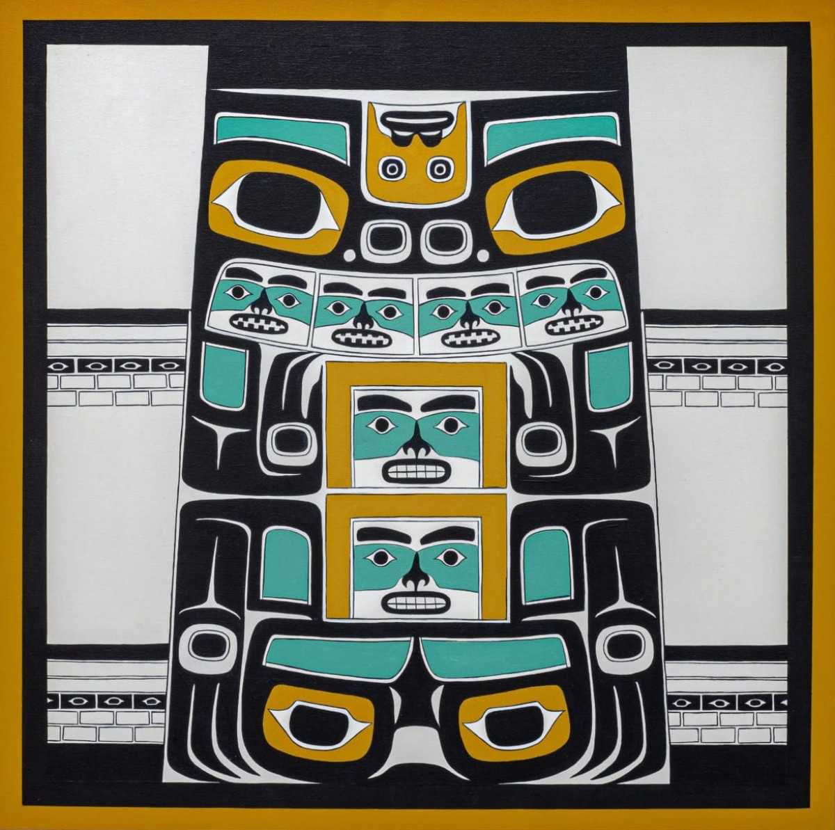 The hallmarks of his art are blending traditional form lines and myths with contemporary symbols, using his personal experiences, and historical events.
