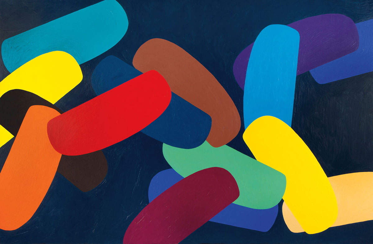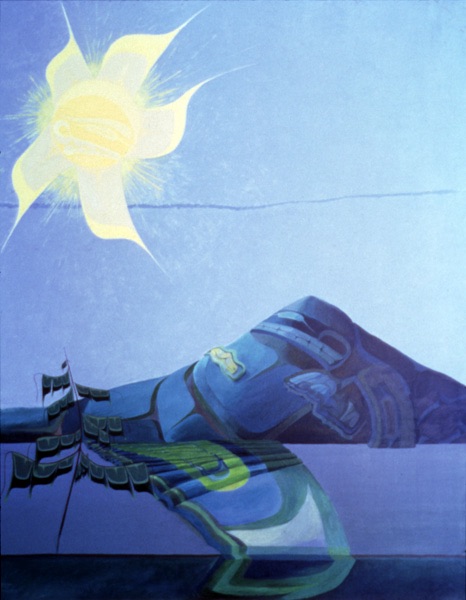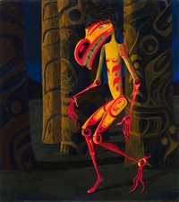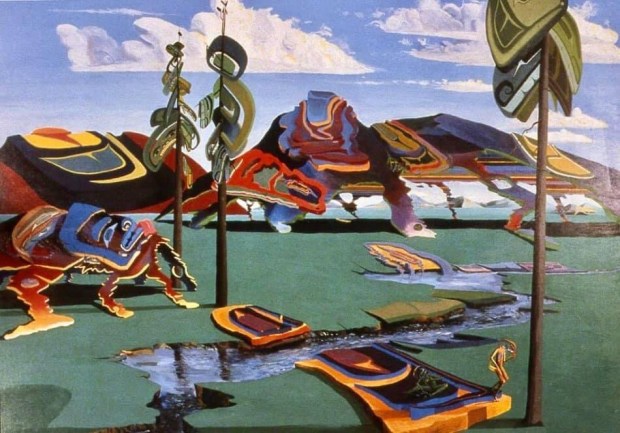 Ovoids are used often to illustrate patterns and figures, a feature of some First Nations art. But, as usual, he approached those paintings using his own style and approach.