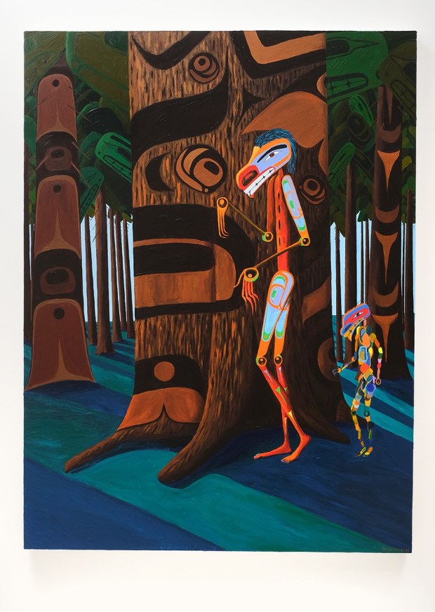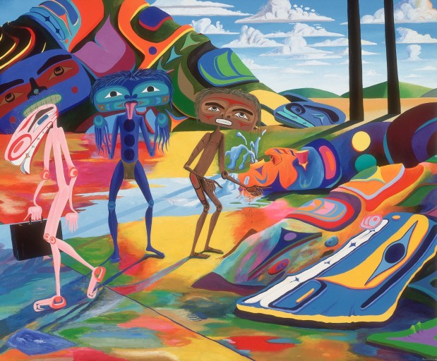 But Yuxweluptun takes it a step further – First Nations people and their land are objects of a white colonial policy designed to subjugate and crush them.