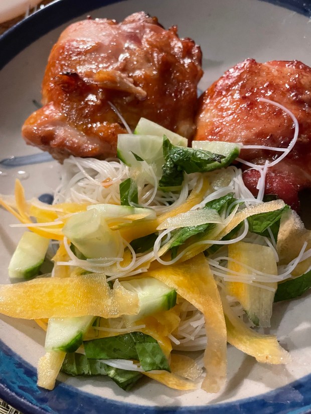 Place the noodles in individual bowls, add the carrots, cucumbers plus some torn mint leaves and cilantro. Omit cilantro if you’re not a fan.
