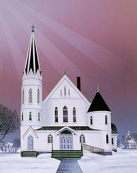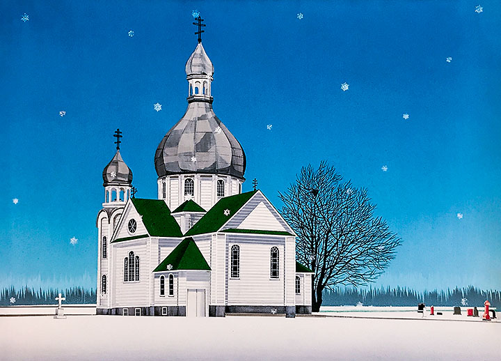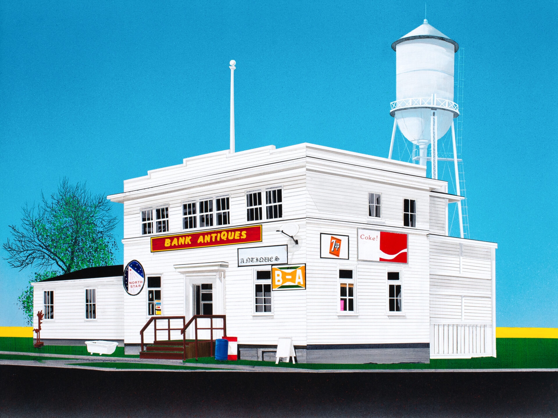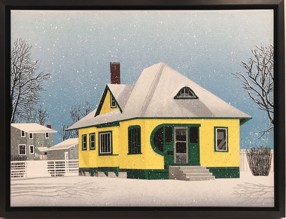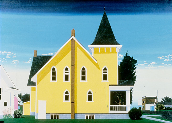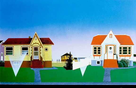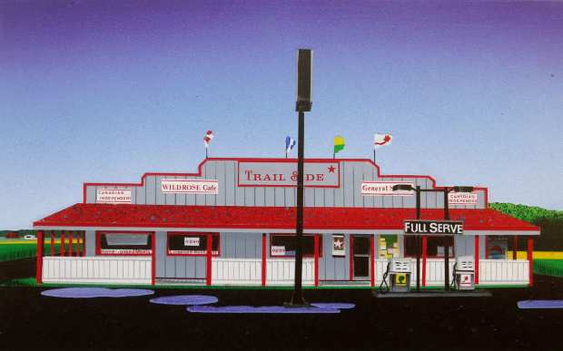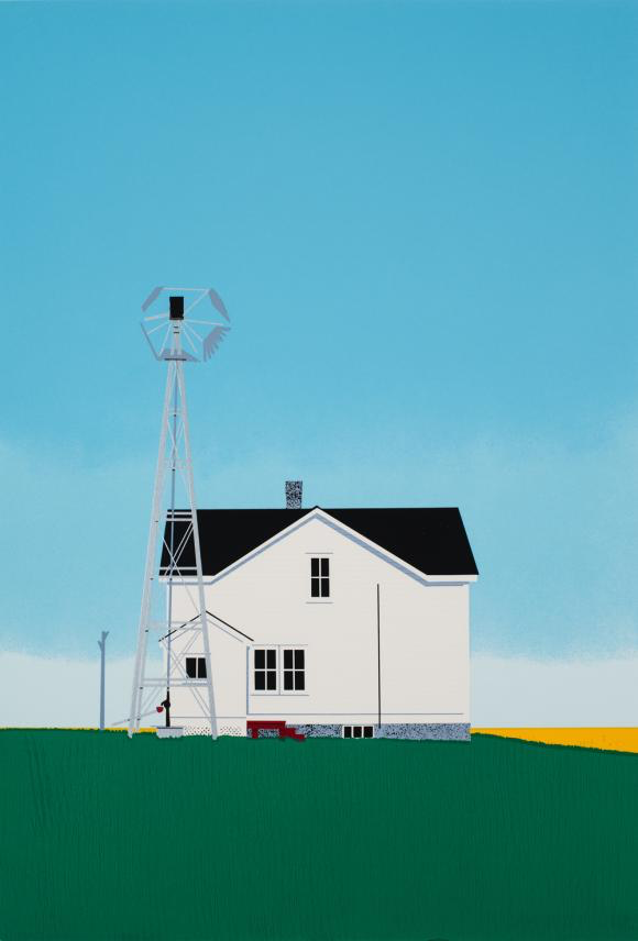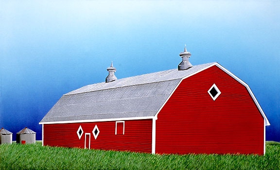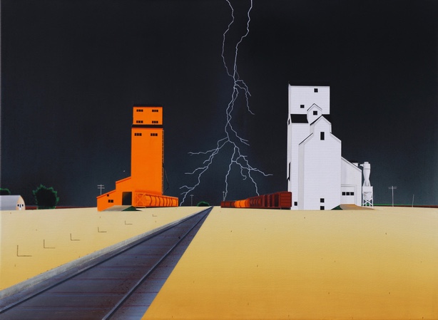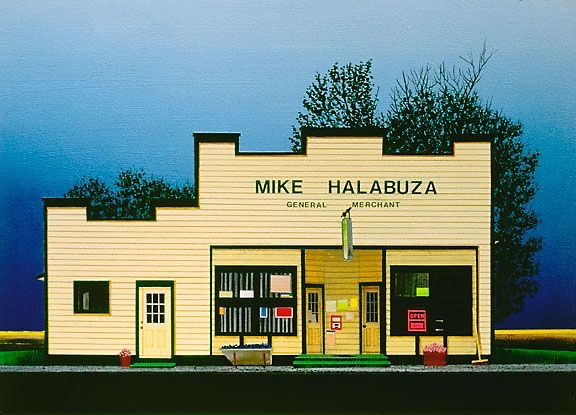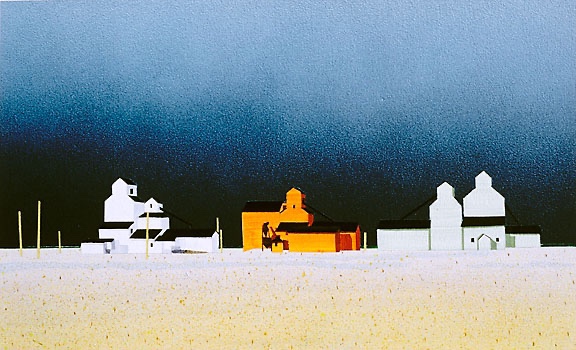 His realist style paints landscapes dotted with familiar images, grain elevators, small houses serenely sitting by themselves almost in the middle of nowhere, small Prairie towns.