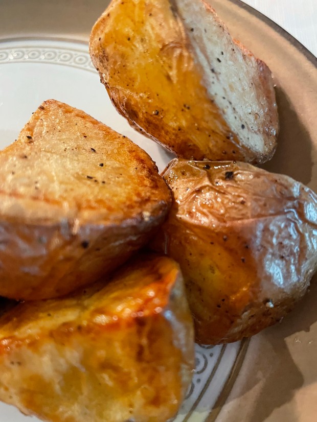 Wash the potatoes and then cut up into little chunks. Dry the chunks with paper towels, place in a small bowl, add the olive oil, add salt and pepper to taste.
