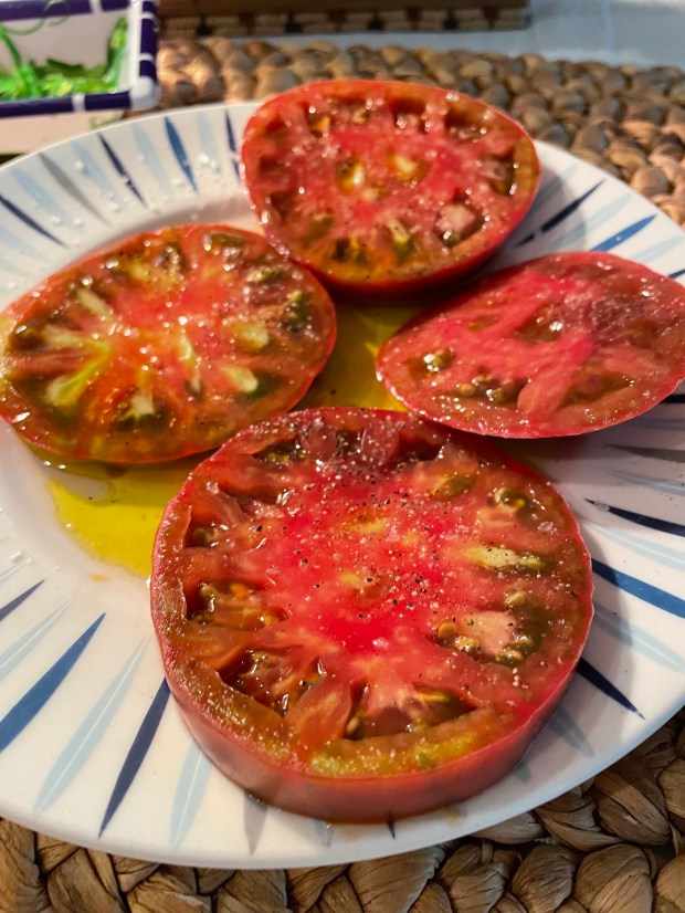 Cut up the tomato into four thick slices, drizzle with the olive oil and season to taste with salt and pepper.