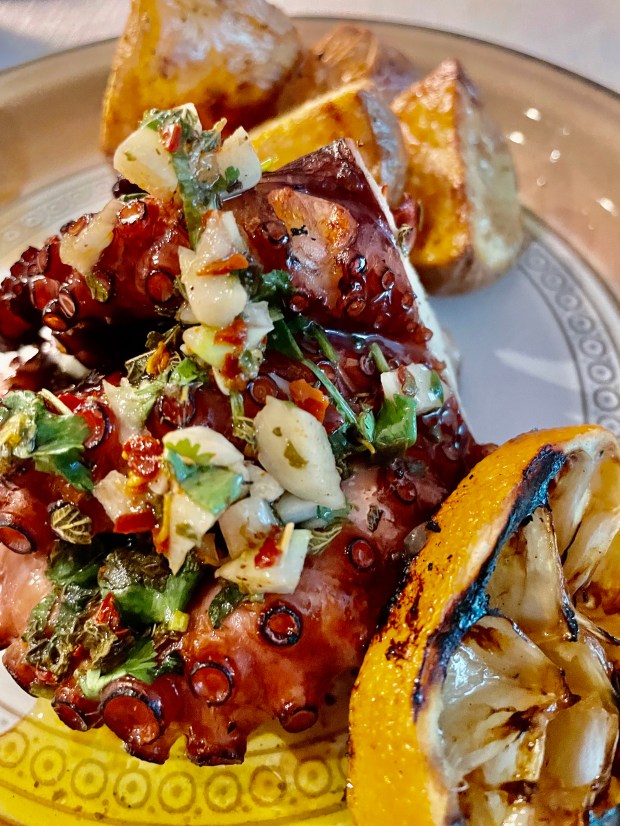 The octopus, juicy, moist, tender, bit of a char taste goes well with the tart lemon sauce, the potatoes crusty on the outside, creamy on the inside, the grilled crusty bread, a nice crunch, perfect with everything else. The tomatoes, sweet, luscious, with that great fruity olive oil.